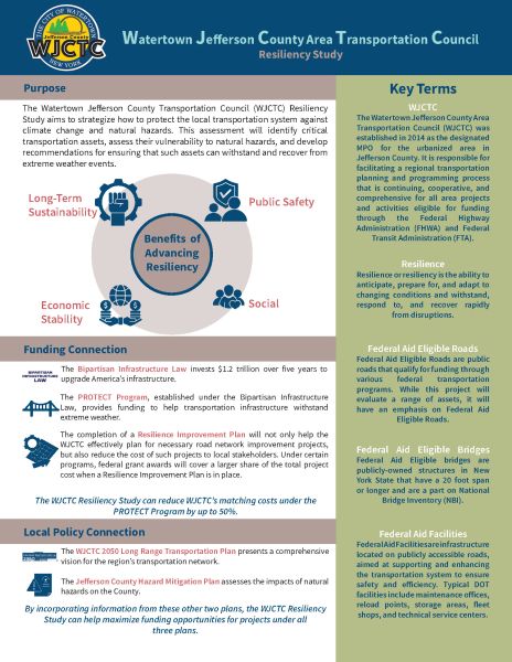 This study provides for an area-wide plan to provide concise guidance to the Watertown-Jefferson County Transportation Council (WJCTC), on best practices for integrating resilience in to its long range planning efforts. The basis for this study is rooted in the understanding that the North Country region within which the WJCTC is located is challenged by extreme weather events and changing conditions including inland flooding, more frequent and severe storm events, worsening drought, and more – all of which can affect the WJCTC’s transportation facilities and systems and result in other social and economic impacts. This study will include recommendations and best practices for incorporating resiliency into goals and objectives, performance measures and targets, risk and vulnerability assessments, needs plans, and investment and project prioritization processes for the MPO’s transportation infrastructure.